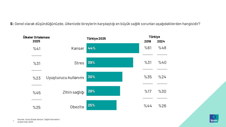 Ipsos’un 30 ülkede 23.172 katılımcı ile yaptığı 2025 araştırması, Türkiye’de kanserin en b...