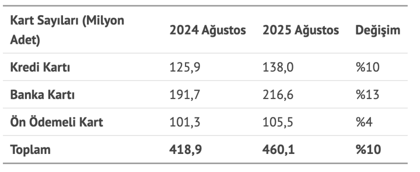 Toplam kart sayısı 460,1 milyon adede ulaşarak yıllık bazda yüzde 10 artış gösterdi. Özellikle banka kartlarında yüzde 13’lük büyüme dikkat çekti.