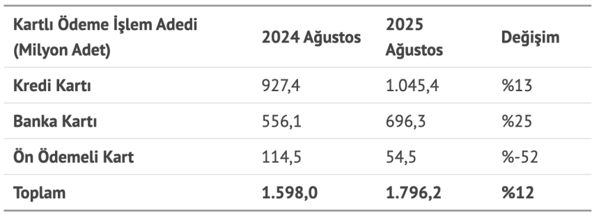- Kredi kartları, banka kartları ve ön ödemeli kartlar ile Ağustos ayında yapılan toplam ödeme adedi bir önceki yılın aynı dönemine göre yüzde 12 artarak 1,8 milyar adet oldu.