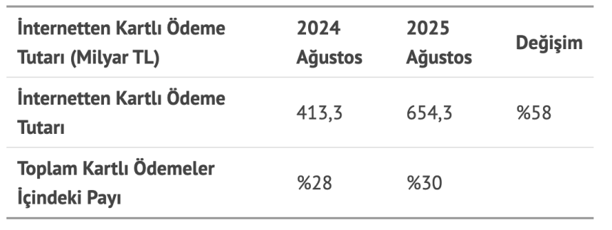 - İnternetten kartlı ödeme tutarı geçen yılın aynı dönemine göre yüzde 58 büyüme ile 654,3 milyar TL
