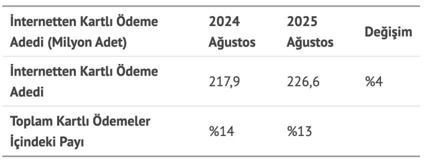 - İnternetten kartlı ödeme adedi, geçen yılın aynı dönemine göre yüzde 4 artarak 226,6 milyon adede yükseldi. İnternetten yapılan kartlı ödemelerin toplam içindeki payı ise yüzde 13’tür.