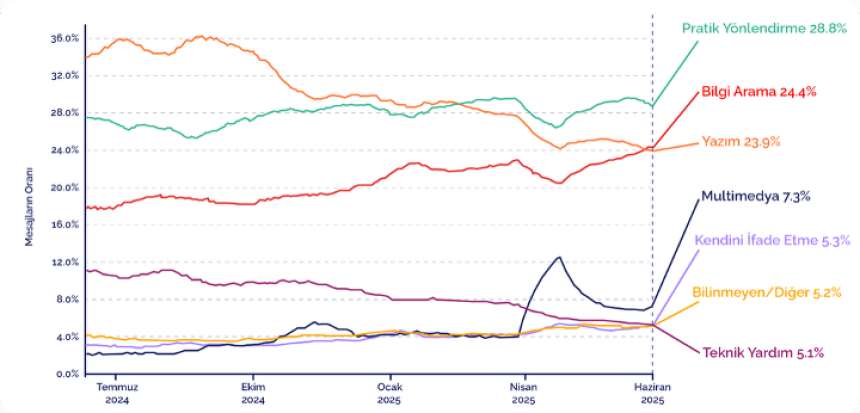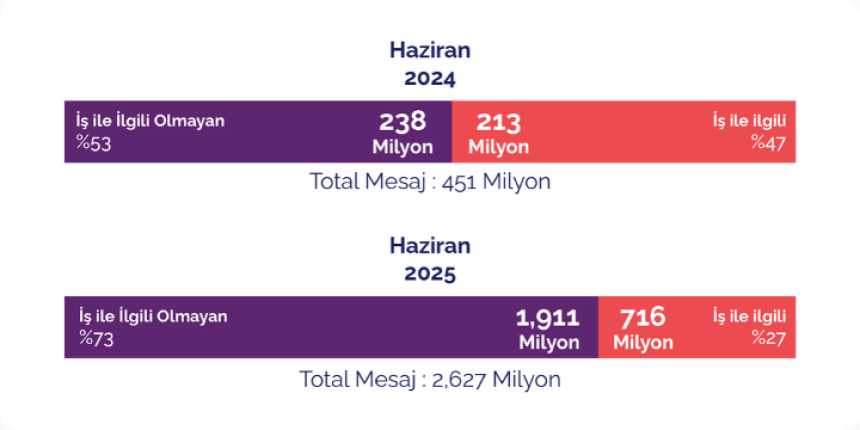 Haziran 2024’te mesajların %47’si iş amaçlı iken, Haziran 2025’te bu oran %27’ye düştü. Toplam mesaj hacmi ise bir yıl içinde 451 milyondan 2,6 milyara çıktı.