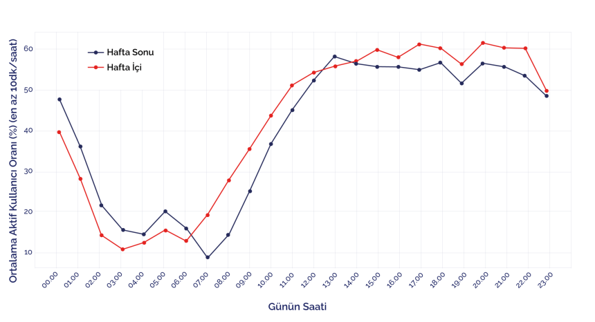 Araştırmanın en dikkat çekici yanlarından biri, ekranın yalnızca gündüz saatlerini değil geceyi de domine etmesi. 23.00–00.00 saat aralığında katılımcıların yaklaşık yarısı aktif; 00.00–01.00 diliminde bu oran hafta içi yüzde 40, hafta sonu yüzde 48’e yükseliyor. Bu saatlerde sadece sosyal medya değil, mobil bankacılık ve çevrim içi alışveriş platformlarının kullanımı da belirgin şekilde artıyor.