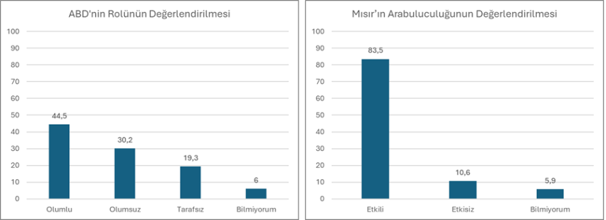 Araştırmada dikkat çeken bir diğer bulguyu, barış sürecinde rol alan uluslararası aktörlere yönelik değerlendirmeler oluşturuyor. Katılımcıların yüzde 83,5’i Mısır’ın arabuluculuğunu olumlu bulurken, ABD’nin rolü konusunda görüşler belirgin biçimde bölünmüş durumda (yüzde 44,5 olumlu). Bu sonuç, bölge halkının diplomatik süreçlerde bölgesel aktörlere daha fazla güven duyduğunu, dış müdahalelere ise mesafeli yaklaştığını ortaya koyuyor.