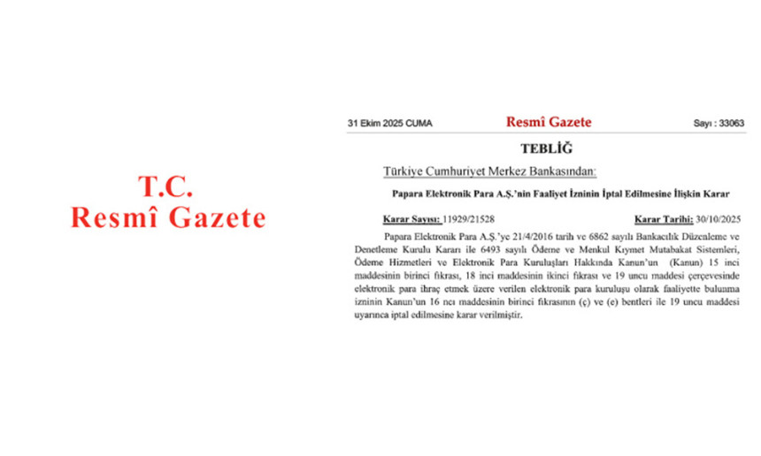Türkiye Cumhuriyet Merkez Bankası (TCMB), elektronik para ve ödeme hizmetleri alanında faaliyet gösteren Papara Elektronik Para A.Ş.’nin faaliyet iznini iptal etti.