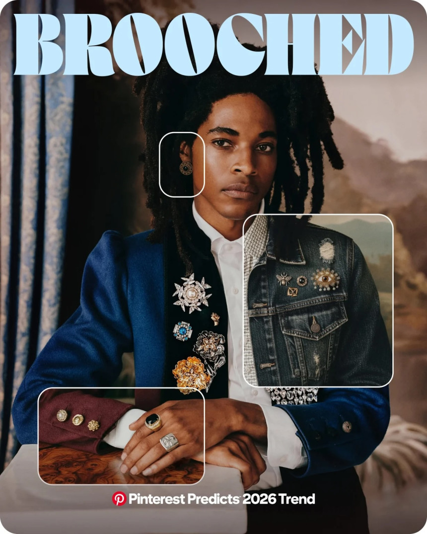 Brooched: Erkek stilinde broşlar yeniden sahneye çıkıyor. Vintage iğneler, kristal klipsler ve miras niteliğindeki parçalar, 2026’da erkek giyiminin yeni odak noktalarından biri hâline geliyor.