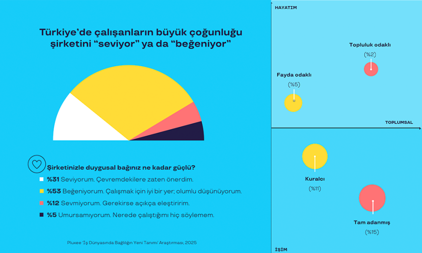 Türkiye’nin de aralarında bulunduğu Brezilya, İngiltere, Hindistan gibi farklı coğrafyalardan 10 ülkede, 8.700 çalışanın katılımıyla gerçekleştirilen araştırmaya göre, küresel olarak çalışanların %83’ü çalıştığı şirketi sevdiğini ya da olumlu hisler beslediğini ifade ediyor. Ancak bu bağlılık artık koşulsuz bir adanmışlık üzerinden değil; denge, anlam ve karşılıklı değer temelinde şekilleniyor.