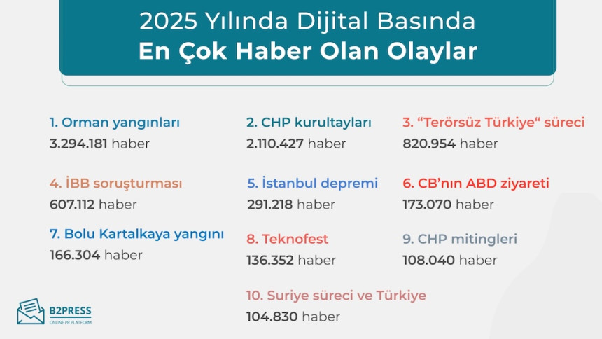 1 Ocak – 30 Aralık 2025 tarihlerinde 20 bini aşkın online mecrada yayımlanan 60.864.567 haberi anahtar kelime bazlı analiz eden B2Press, dijital basının 2025 gündemini ortaya koydu. Online PR Platformu B2Press’in bu yıl 7. kez hazırladığı Dijital Basın Raporu’na göre, dünyada savaşların gündemden düşmediği ve küresel dengelerin yeniden şekillendiği 2025’te, Türkiye’nin dijital gündemini afetler, siyaset ve terör belirledi. Yıl boyunca basında en çok konuşulan başlık orman yangınları olurken, haberlerde en çok kullanılan ifade olarak kadın cinayetleri dikkat çekti.