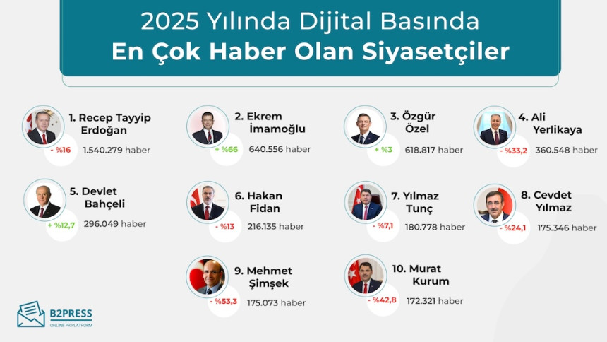 Hareketli günlere sahne olan iç politikada, siyasi liderler de dijital basının odağında kalmayı sürdürdü. Hakkındaki haber sayısı 2 yıldır üst üste gerilese de Recep Tayyip Erdoğan, 1.540.279 haberle yine listenin zirvesine yerleşti. Ekrem İmamoğlu, önceki yıla göre %66 artışla 640.556 habere konu olurken, 2024’te %238’lik rekora imza atarak listeye 2. sıradan giren Özgür Özel, bu kez 618.817 haberler 3. sırada konumlandı. Geçtiğimiz yıl 2. sırada bulunan Ali Yerlikaya, %33 düşüşe rağmen 360.548 haberle dördüncülüğü korudu. Devlet Bahçeli ise %13’e varan artışla 296.049 habere konu oldu ve 5. sırada yer aldı.