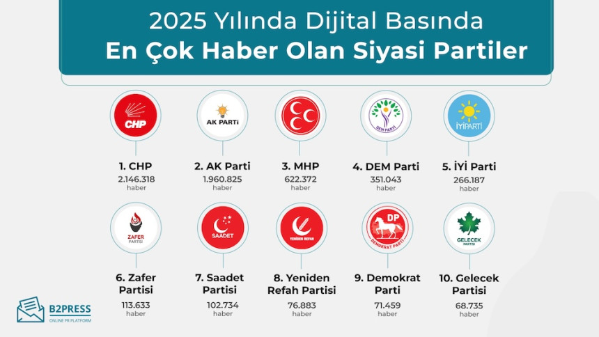 B2Press Dijital Basın Raporu 2025’te hakkında en çok haber yapılan siyasi partilere de yer verildi. İlk sırada 2 milyonu aşkın haberle CHP yer aldı. Onu, 2 milyona yaklaşan haberlerle AK Parti izlerken, en çok haber olan siyasi partiler listesinde üçüncülüğü MHP aldı. Siyasi partileri konu eden haberlerin 4. sırasında DEM Parti yer alırken, onu İYİ Parti izledi. Listenin ilk 10 sırasındaki siyasi partiler hakkında toplam 5.780.189 haber yapıldı.