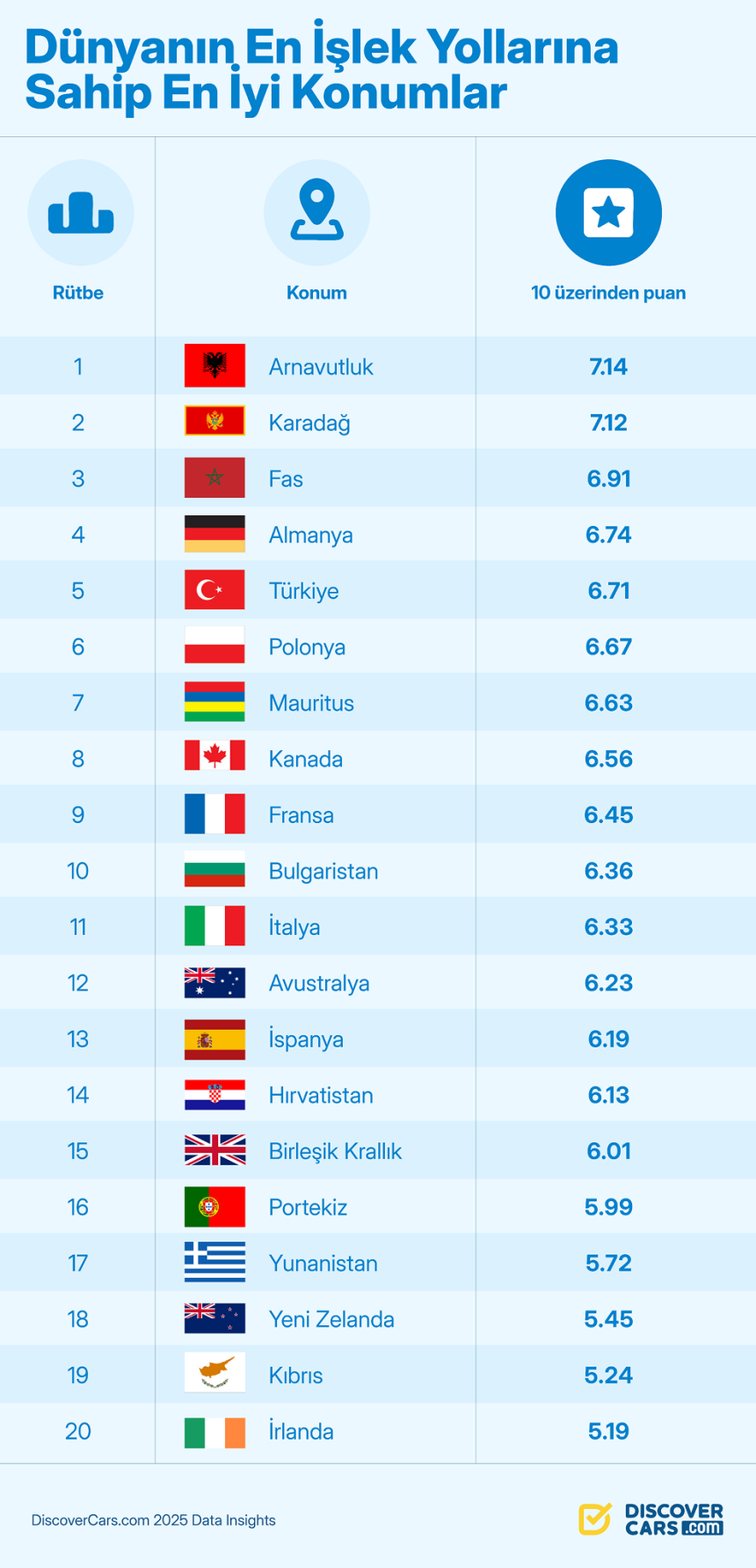 Küresel araç kiralama karşılaştırma platformu DiscoverCars.com, dünya genelinde sürücülerden aldığı geri bildirimlerle “En İşlek Yollar” araştırmasını açıkladı. Çalışmada 12 bin kişi, seyahat ettikleri rotaları 0 “sessiz” ile 10 “çok kalabalık” arası bir ölçekle değerlendirdi.