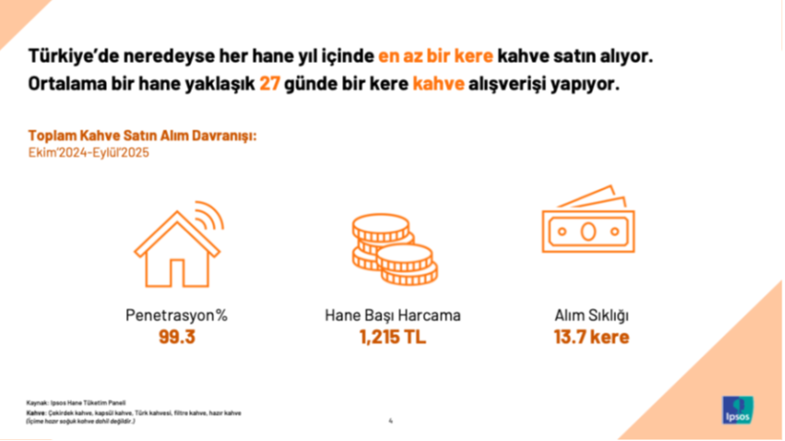 Kahve her evde: Ortalama iki çeşit kahve satın alınıyorIpsos verilerine göre Türkiye’de hanelerin neredeyse tamamı en az bir tür kahve satın alıyor. Ortalama kahve çeşitliliği ise hane başına iki farklı ürün seviyesinde. Bu çeşitliliğin arkasında Türk kahvesi ve filtre kahvenin yanı sıra uzun süredir yükselişte olan çekirdek, kapsül ve soğuk kahve bulunuyor.