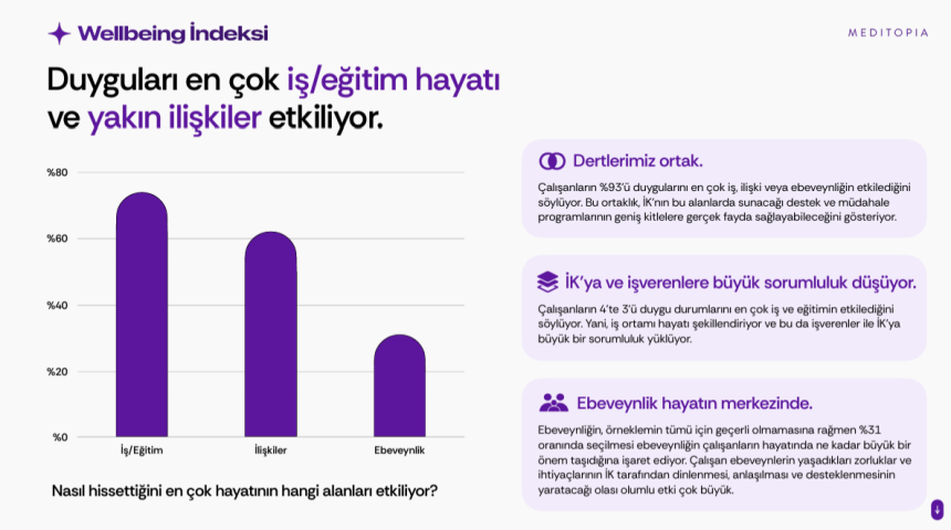 Ülke genelinde 15 bini aşkın çalışanın katıldığı araştırmanın sonuçlarına göre çalışanların genel esenlik seviyesinin 54,4 puanla orta düzeyde seyrettiği raporlandı. 100 puan üzerinden yapılan skorlamada 66 puanla stres ve 63,3 puanla kaygı indekslerinin ise yüksek seviyelerde olduğu vurgulanıyor. Meditopia uzmanlarına göre bu tablo, yılın farklı dönem ve aylarında değişkenlik gösteriyor ve çalışanların yıl boyunca duygusal dalgalanmalar yaşadığını ve destek mekanizmaları yetersiz kaldığında bu dengenin hızla bozulabildiğini ortaya koyuyor.