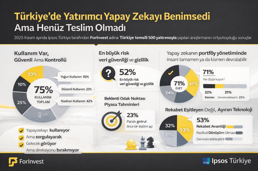 Türkiye’de bireysel yatırımcıların yapay zekayla kurduğu ilişki, çoğu teknoloji anlatısında gördüğümüz siyah-beyaz kalıplara pek uymuyor. Ne kör bir hayranlık var ne de refleksif bir reddiye. Ipsos Türkiye tarafından ForInvest adına Kasım 2025’te gerçekleştirilen “Yatırım & Yapay Zeka Araştırması 2025”, tam da bu gri alanı görünür kılıyor.