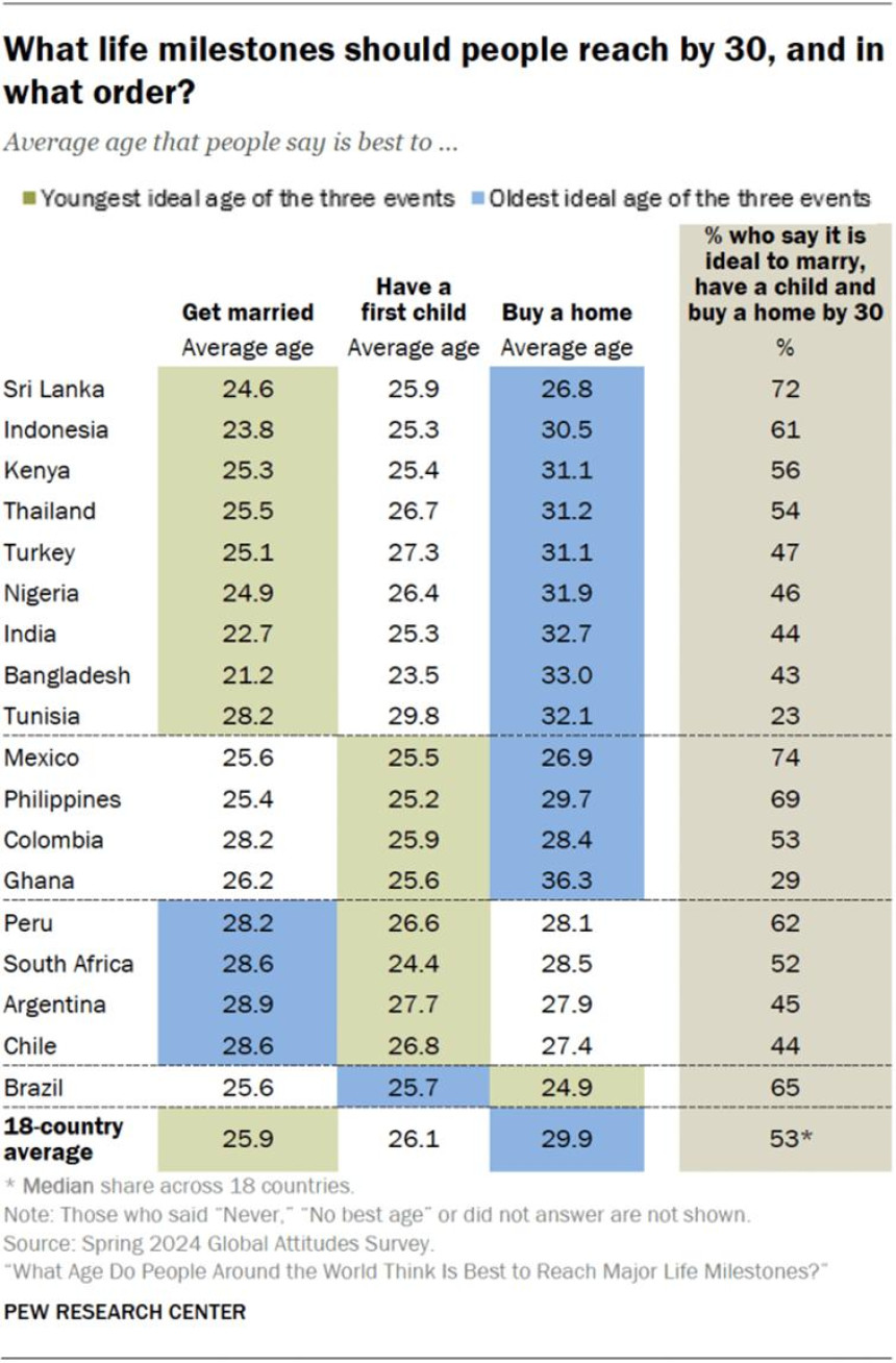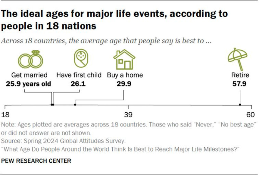Pew Research Center’ın Mart 2025’te yayımladığı “What Age Do People Around the World Think Is Best to Reach Major Life Milestones?” (Dünya Çapında İnsanlar, Önemli Yaşam Dönüm Noktaları İçin En Uygun Yaşın Kaç Olduğunu Düşünüyor?) başlıklı araştırmasına göre; katılımcıların büyük çoğunluğu, özellikle orta gelirli ülkelerde, hayatın temel kilometre taşlarına belirli bir yaşa kadar ulaşmanın ideal olduğunu düşünüyor. Buna göre evlenmek, çocuk sahibi olmak ve ev sahibi olmak için 30 yaş en uygun zamanlar olarak görülürken; emeklilik için en doğru yaş ise 60 olarak kabul ediliyor.