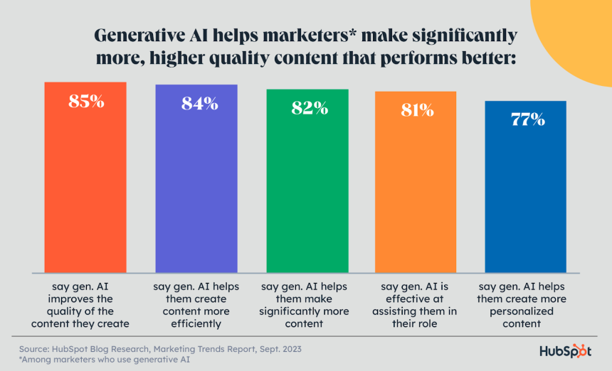Hepsinden önemlisi, içerik oluşturmak için üretken yapay zekayı kullanan pazarlamacıların %56'sı, bu içeriğin, onsuz oluşturulan içerikten daha iyi performans gösterdiğini söylüyor.