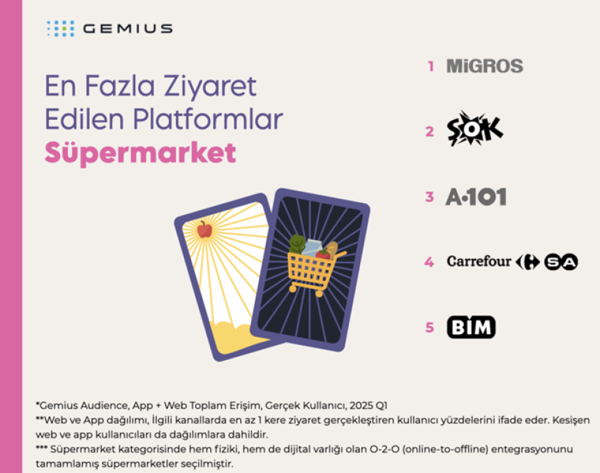 Süpermarket tarafında en çok ziyaretçi çeken platform Migros olurken, ŞOK Marketler, A101, CarrefourSA ve BİM listenin öne çıkan diğer isimleri oluyor.