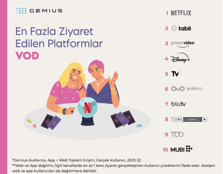 Dizi ve film Netflix’te izlenir2025 yılı itibarıyla dünya genelindeki abone sayısını 301 milyona çıkaran ve alanında bir numara olan Netflix, VOD kategorisi altında en çok ziyaretçi çeken platform olurken, TRT’nin Tabii ve Amazon’un Prime Video platformları da ilk üçte kendine yer buldu.