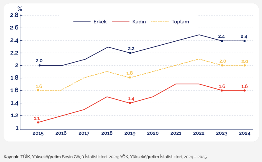 2024–2025 öğretim yılında Türkiye’de toplam 208 yükseköğretim kurumunda 6.835.115 öğrenci, 185.169 öğretim elemanı bulunuyor; 2023–2024 akademik yılında 919.373 kişi mezun oldu. 2024’te yükseköğretim mezunlarının beyin göçü oranı ise %2,0 (2019: %1.8; 2015: %1.6); önceki yıla göre sabit kaldı. Kadınlarda %1,6, erkeklerde %2,4 bu oran.