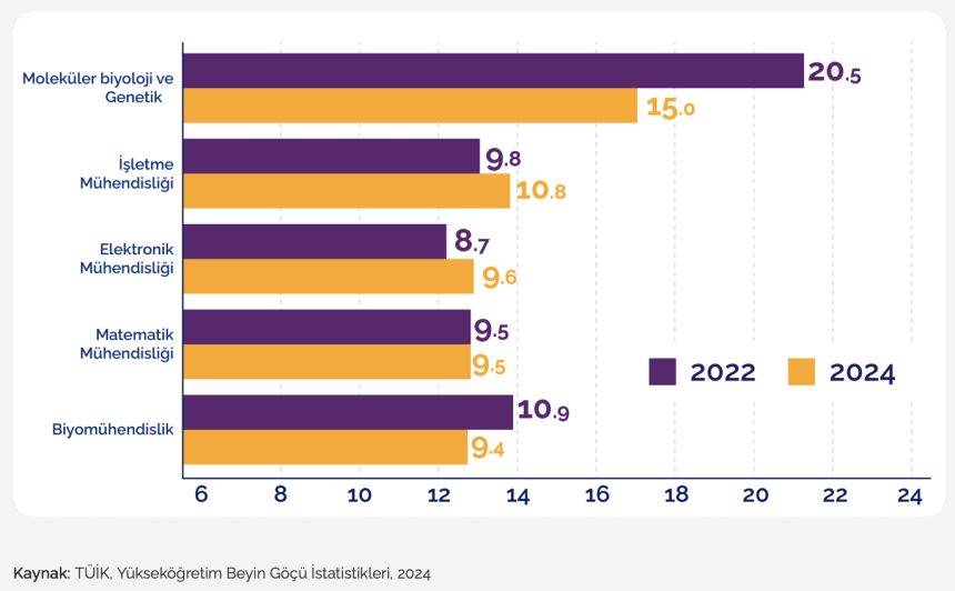 En yüksek beyin göçü oranına sahip bölüm ise (2022 düzeyine göre 5.5 puan düşse de) açık ara farkla moleküler biyoloji ve genetik olmaya devam ediyor.