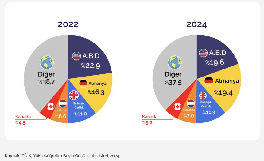 2022 ile 2024 yılları kıyaslandığında beyin göçünün çekim merkezleri açısından en büyük farkı yaratan (3.3 yüzde-puanlık düşüşle) ABD ve (3.1 yüzde-puan artışla) Almanya oldu. İrlanda'nın payı iki yılda %1.3'ten 1.9'a; Polonya'nın payı %1.6'dan 1.9'a; Fransa'nın payı ise %2.9'dan 3'e çıktı. İkinci Trump döneminin belirsizliği ve özellikle de uluslararası öğrencilerin geleceklerini daha çok tehdit eden icraatleri Atlantik'in diğer yakasını daha cazip kılıyor..