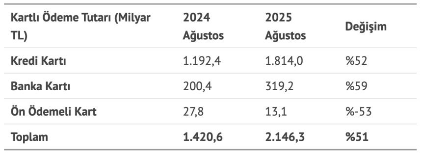 - Kredi kartları, banka kartları ve ön ödemeli kartlar ile Ağustos ayında yapılan toplam ödeme tutarı bir önceki yılın aynı dönemine göre yüzde 51 artarak 2.146,3 milyar TL oldu.