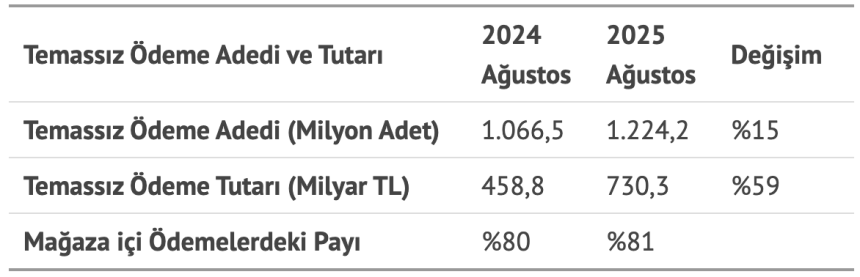 Mağaza içi her 5 ödemeden 4’ü temassız gerçekleşti. Ağustos ayında temassız ödeme adedi yüzde 15 artışla 1,22 milyar adet olurken, temassız ödemelerin toplam tutarı yüzde 59 büyüyerek 730,3 milyar TL seviyesine ulaştı.