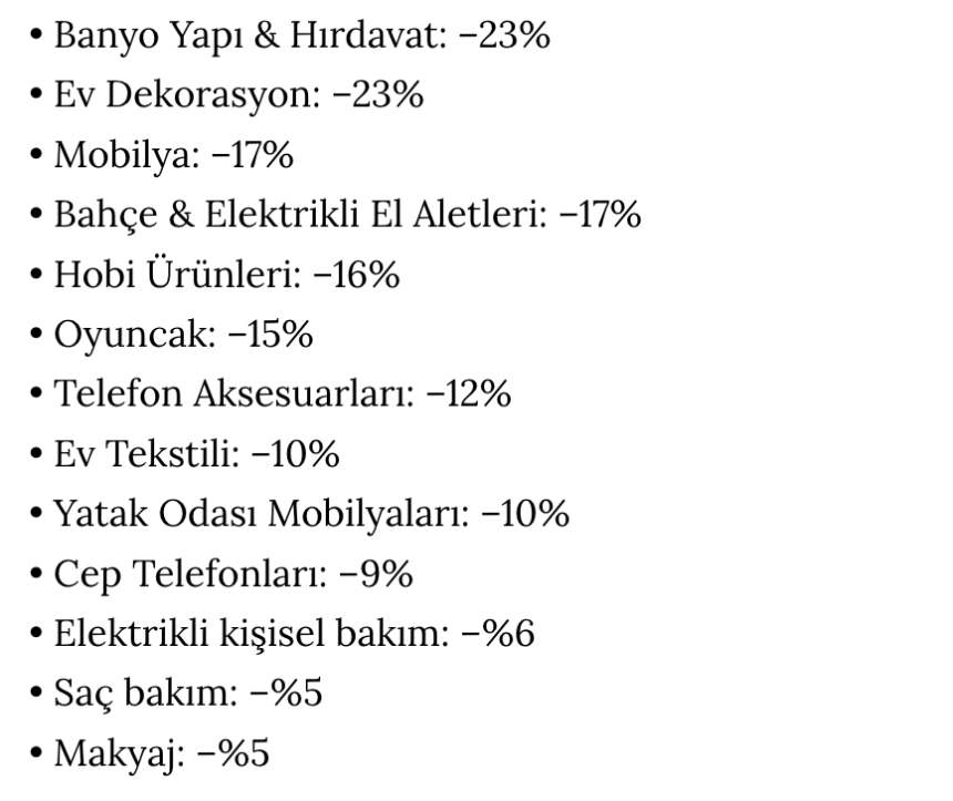 E-Ticaret platformlarında kasımdaki online fiyat değişimlerine göre, en fazla indirim sunulan kategoriler Banyo Yapı & Hırdavat ve Ev Dekorasyon oldu. Her iki segmentte fiyatlar yüzde 23 oranında geriledi. Bu kategorileri Mobilya ile Bahçe & Elektrikli El Aletleri izledi; her iki grupta indirim oranı yüzde 17 seviyesinde gerçekleşti. Elektronik tarafta ise cep telefonlarında yüzde 9’luk gerileme, yüksek sepet değerli ürünler açısından tüketicinin en fazla avantaj sağladığı alanlardan biri olarak öne çıktı. Cep telefonu kategorisi Kasım boyunca en yoğun kampanya uygulanan, gün içinde en sık fiyatı güncellenen ve talep artışına en hızlı yanıt veren segmentlerden biri oldu. Kişisel bakım ve kozmetik tarafında da aşağı yönlü bir hareket izlendi; elektrikli kişisel bakım ürünleri yüzde 6, saç bakım ürünleri yüzde 5, makyaj kategorisi ise yüzde 5 geriledi.