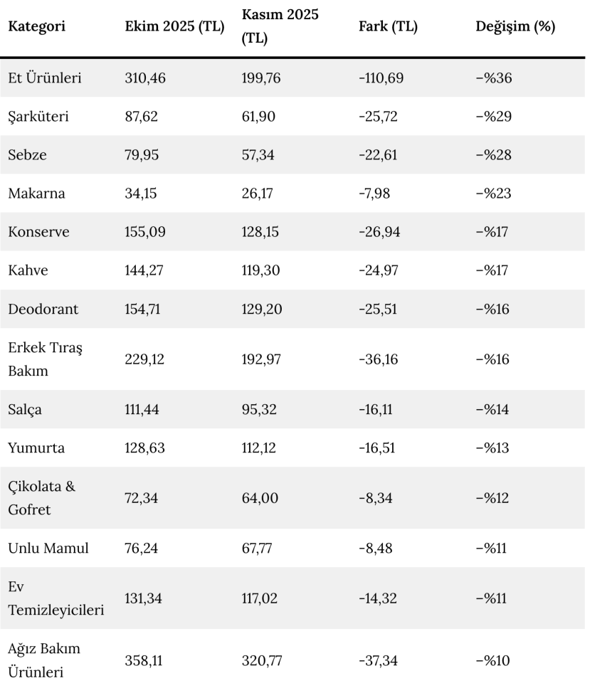 Rapora göre Kasım ayında market raflarında en çok et, şarküteri ve sebzede indirim yaşandı. Ette yüzde 36’ya varan gerileme, temel gıda fiyatları içinde en yüksek indirim olarak kaydedildi. Ekim ayında ortalama 310 TL olan et ürünleri, Kasım’da 199 TL’ye kadar geriledi. Bu, 110 TL’den fazla bir düşüş anlamına geliyor. Bu tabloyu sırasıyla şarküteri ürünlerinde yüzde 29, sebze grubunda yüzde 28, makarnada yüzde 23, konserve ve kahvede yüzde 17 oranındaki indirimler izledi. Kişisel bakım tarafında da belirgin bir hareketlilik yaşandı; deodorant ve erkek tıraş bakım ürünleri yüzde 16, ağız bakım ürünleri yüzde 10 düzeyinde geriledi.