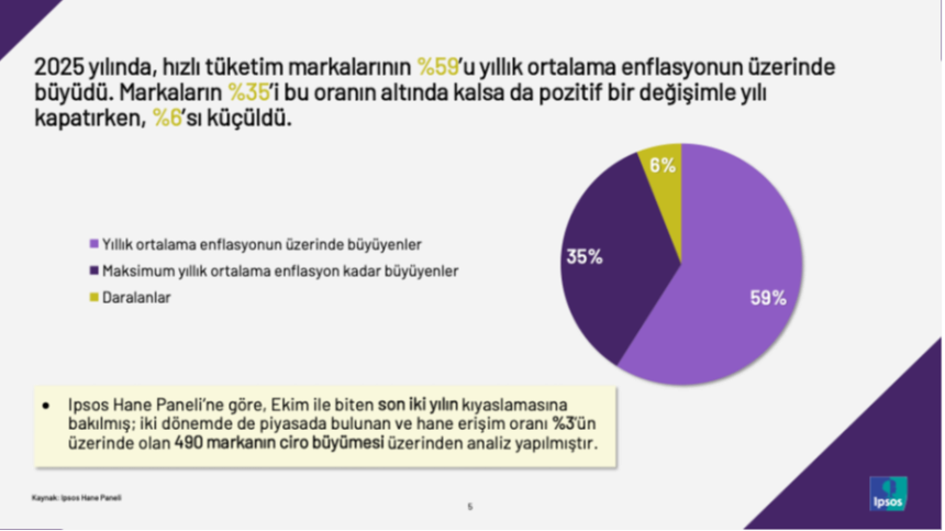 “Ipsos Hane Paneli verilerine göre, hızlı tüketim ürünü markalarının yüzde 59’u yılı ortalama enflasyonun üzerinde bir büyüme sergileyerek, yüzde 35’i ise bu oranda olmasa da yine pozitif bir değişimle kapattı. Tabii bu noktada büyümenin niteliğini biraz sorgulamak gerekir; çünkü söz konusu ‘büyüme’ ve özellikle de bunun sürdürülebilirliği olduğunda ‘yüzde kaç’ sorusundan öte ‘nasıl’ sorusu da devreye girmeli.