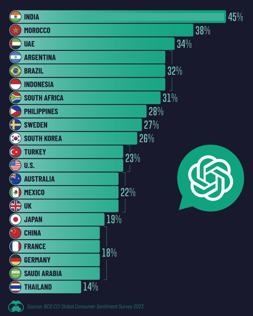 Ankete katılan ülkeler arasında ChatGPT’yi kullanım oranı en yüksek ülke yüzde 45 ile Hindistan oluyor. Hindistan’ın bilgi teknoloji alanındaki yatırımları ve bu alandaki başarıları göz önüne alındığında bu sonuç bir sürpriz olmuyor.