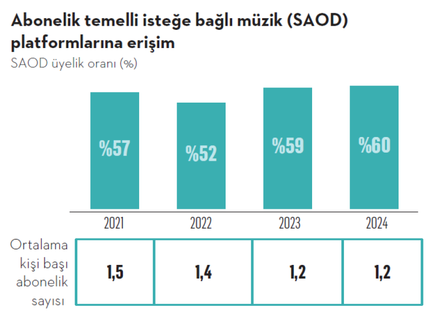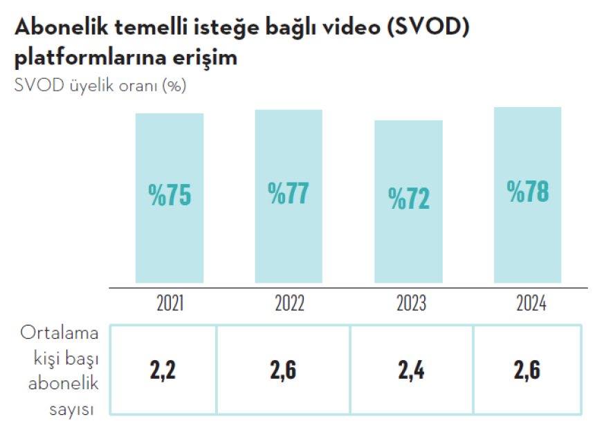 Pandemi ile birlikte artan abonelik temelli isteğe bağlı video (SVOD) platformu üyelik oranı, 2024 yılında pandemi seviyesinin üzerine çıkarken müzik platformlarına erişim de son dört yılın en yüksek seviyesine ulaştı. Her iki platform da sırasıyla yüzde 81 ve yüzde 64 oranlarıyla kadınlar arasında daha yaygınken, yaş grupları açısından bakıldığında ise 18-34 yaş grubunda daha yüksek oranlar görülüyor.