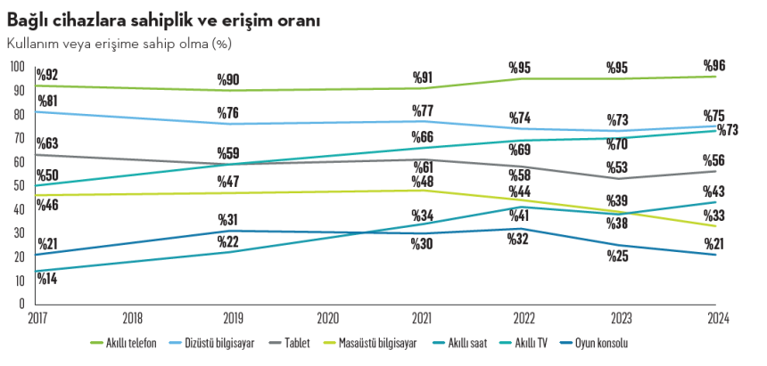 Cihaz kullanım sıklığı geçen yılla paralellik gösteriyor. Cihaz erişimi ve sıklığı ise yine geçen seneye benzer bir seyir izlerken tablet, dizüstü bilgisayar, akıllı TV ve akıllı saat sahipliğiyle erişiminde artış, masaüstü bilgisayar ve oyun konsolu sahipliği ve erişiminde ise düşüş görülüyor. Tüketicilerin önlerindeki 12 ay boyunca satın alma eğilimleri incelendiğinde sadece yüzde 10’unun hiçbir cihaz satın alma planı olmadığı görülüyor.