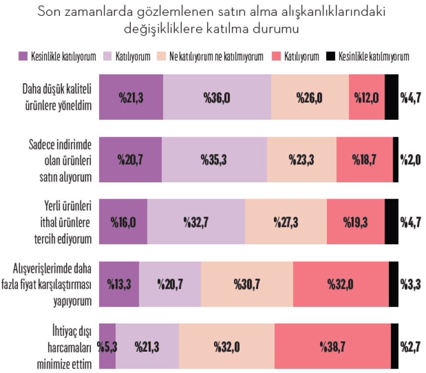 Araştırma bulgularına göre tüketiciler ekonomik belirsizlikler karşısında psikolojik bir uyum sürecinde. Artan fiyat baskısı ve mali kaygılar bireyleri uzun vadeli faydalar yerine kısa vadede daha uygun fiyatlı çözümler aramaya itiyor. Kaliteyi göz ardı ederek daha düşük fiyatlı ürünlere yönelme, bireylerin bütçeleri üzerindeki kontrol hissini yeniden kazanmaya çalıştıkları bir strateji olarak karşımızda duruyor.