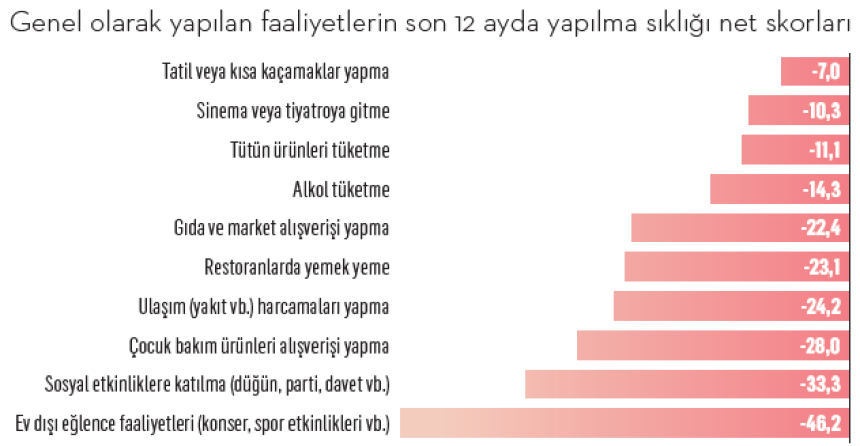 Araştırma bulguları, tüketicilerin ekonomik baskılar karşısında yaşam tarzlarında ve harcama alışkanlıklarında ciddi değişimler yaşadığını gözler önüne seriyor. Özellikle sosyal ve eğlence aktiviteleri gibi ev dışı harcamalarda belirgin bir düşüş yaşandığı dikkat çekiyor.