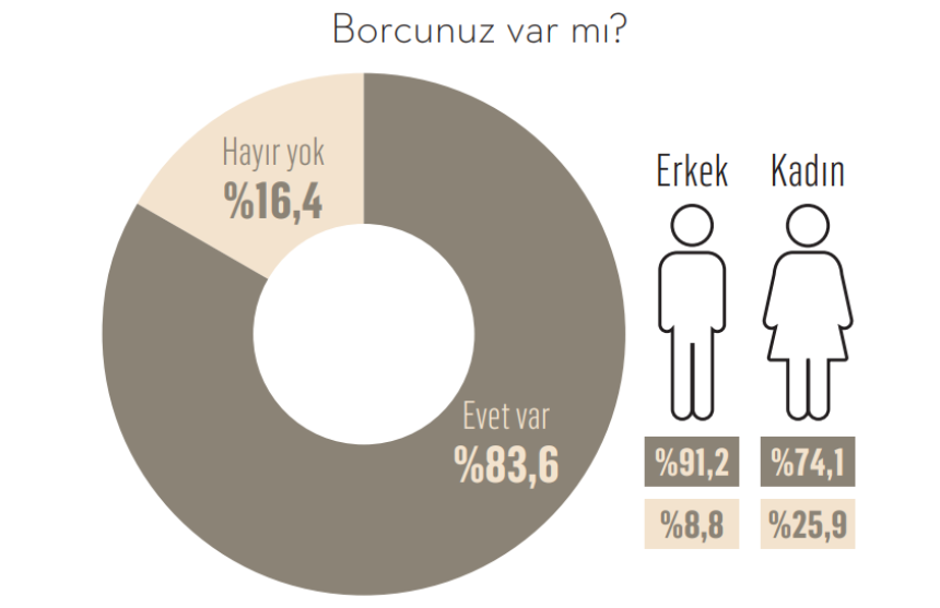 Pek çok yanıtında ekonomik sıkıntının izlerine rastladığımız bu kitlenin elbette borcu var (yüzde 83,6). Bu noktada dikkat çeken detaysa erkeklerin (yüzde 91,2) borçlanma oranının kadınlara (yüzde 74,1) kıyasla daha yüksek seyretmesi oluyor. Genel kitlenin yüzde 25,5’i geliriyle eşit oranda borçlanırken, 25,5’i iki katı, 25,5’i ise üç katı borcu olduğunu ifade ediyor. Yüze 17,6’lık bir kitlenin ise borcu gelirinin 5 katını aşmış durumda…