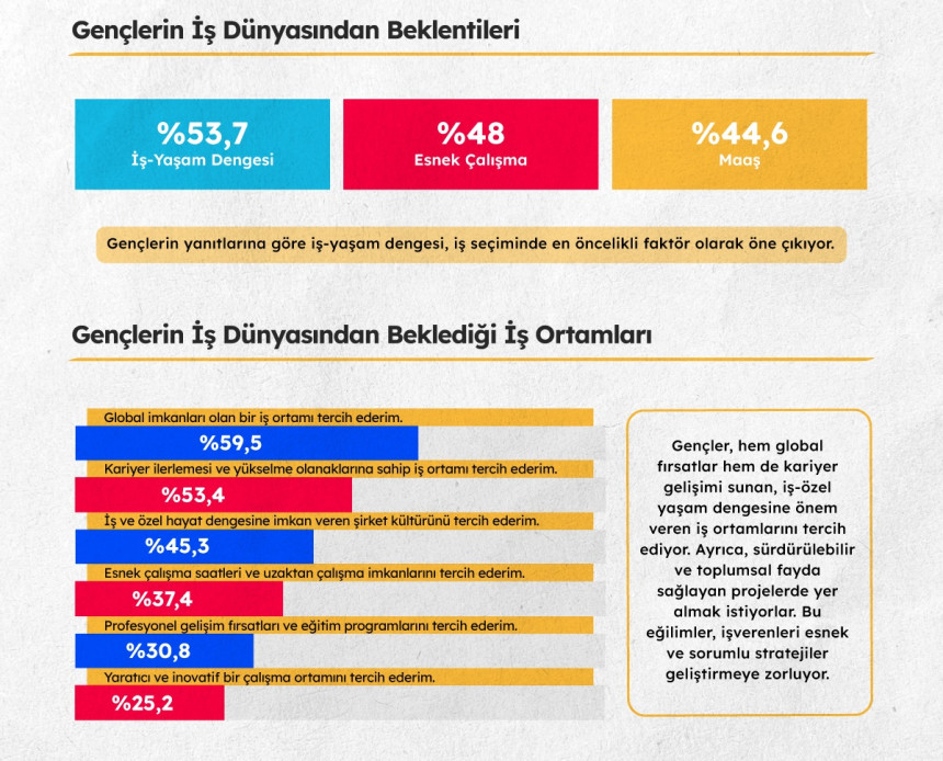 Araştırma sonuçlarına göre gençlerin iş seçimlerinde önem verdikleri faktörler geçen seneye göre değişiklik gösterdi. Geçen yıl gençlerin ilk öncelikleri arasında maaş seviyeleri ve anlamlı bir işin parçası olma arzusu öne çıkarken 2024 yılında iş-yaşam dengesi daha önemli bir faktör haline geldi. Araştırmaya göre katılımcıların yüzde 53,7’si iş-yaşam dengesinin iş seçiminde en önemli faktör olduğunu belirtirken yüzde 48’i esnek çalışma koşullarına sahip işlerde çalışmayı tercih ettiğini ifade ediyor.