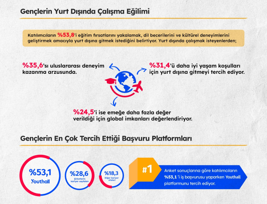 Bir de yurt dışına gidebilseler!Youthall’un yaptığı araştırma, 2023 yılındaki trendin devam ettiğini ve gençlerin yurt dışı hayallerinin hala yüksek olduğunu ortaya koyuyor. Katılımcıların yüzde 53,8’i eğitim fırsatlarını yakalamak, dil becerilerini ve kültürel deneyimlerini geliştirmek amacıyla yurt dışına gitmek istediğini belirtiyor. Yurt dışına gitmek isteyenlerden yüzde 35,6’sı bu isteğin en büyük sebebinin “uluslararası deneyim kazanmak” olduğunu ifade ediyor. Yüzde 31,4’ü yurt dışındaki daha iyi yaşam koşulları nedeniyle gitmeyi tercih ederken yüzde 24,5’i emeğe verilen değerin Türkiye’ye kıyasla yurt dışında daha yüksek olmasını bu kararlarının temel sebebi olarak gösteriyor.