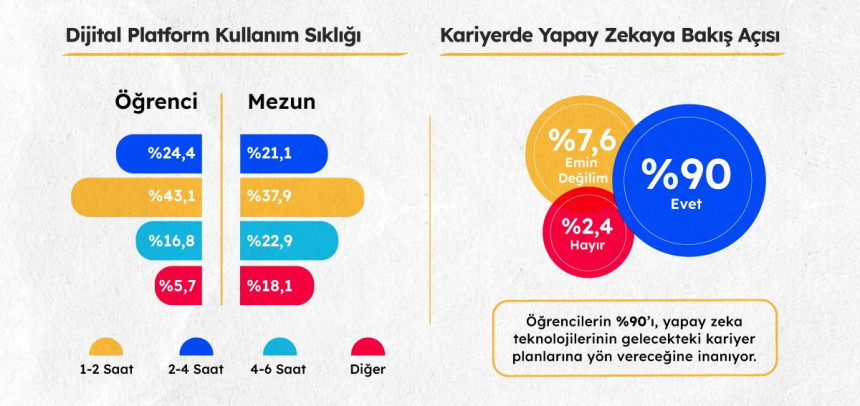 Yapay zekâ teknolojileri gençler arasında giderek daha fazla ilgi görse de bu konudaki bilgi eksikliği hala önemli bir bariyer olarak öne çıkıyor. Araştırmaya katılan öğrencilerin yüzde 47,2’si yapay zekâ uygulamalarını sık sık kullandığını belirtirken, bu oran mezunlar arasında yüzde 29,7’ye düşüyor. Neden kullanmadıkları sorusuna öğrencilerin yüzde 43,9’u faydalarını bilmediği yanıtını verirken mezunların yüzde 54,2’si henüz fırsat bulamadığını belirtiyor.