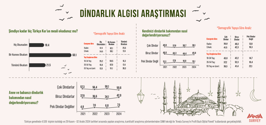 Areda Survey, Türkiye’nin dindarlık algısını araştırdı. Araştırma sonuçlarına göre, Türk halkının yüzde 21,5’i Kur’an mealinin tamamını okuduğunu belirtirken, yüzde 18,4’ü hiç okumadığını ifade ediyor. Kendini “çok dindar” olarak tanımlayanların oranı yüzde 39,1. Erkekler yüzde 41,5 oranıyla kadınlara (yüzde 36,8) kıyasla kendilerini daha dindar görüyor. Yaş grupları arasında kendisini “çok dindar” olarak nitelendirenlerde 18-34 yaş grubundaki gençler yüzde 43 ile ilk sırada yer alıyor. Bunun yanında, anne ve babalarını “çok dindar” görenlerin oranı, bir önceki yıla kıyasla yüzde 8,5’lik bir düşüş gösteriyor.