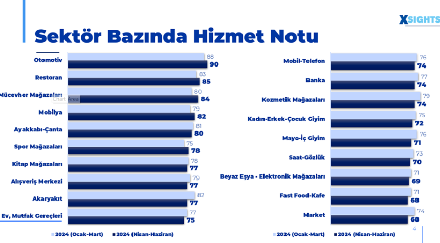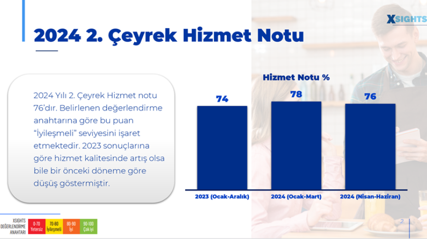 Türkiye perakendesinin hizmet notunu tespit edebilmek için XSIGHTS Müşteri Deneyimi ve Gizli Müşteri Departmanı tarafından 3 ayda bir gerçekleştirilen, hazır giyimden markete, beyaz eşyadan mobilyaya, otomotivden bankaya, restoran/kafeye, markete; müşteriye birebir hizmet veren satış noktalarını kapsayan gizli müşteri çalışması sonuçlarına göre 2024 yılı ikinci çeyrek hizmet notu 76 olarak tespit edildi. 2024 yılı ilk çeyrekle kıyaslandığında hizmet kalitesinde yüzde 3 oranında düşüş dikkat çekiyor!