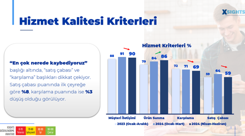 Bu dönem sonuçlarına bakıldığında “en çok nerelerden kaybediyoruz” başlığı altında, “satış çabası” ve “karşılama” başlıkları dikkat çekiyor. Satış çabası notunda ilk çeyreğe göre yüzde 8, karşılama notunda ise yüzde 3 düşüş olduğu görülüyor.