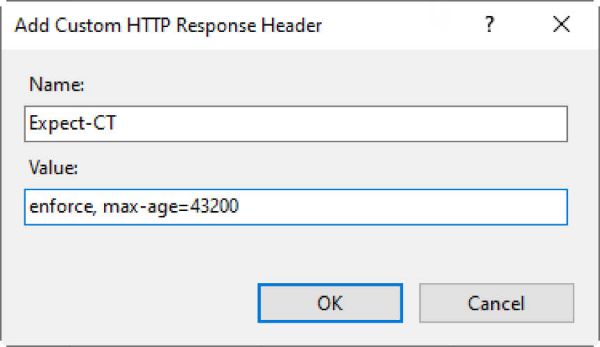 Method 1: Using the IIS manager Select Start, select Administrative Tools, and then select Internet Information Services (IIS) Manager. In the connections pane, expand the node for the server, and then expand Sites. Select the site hosting Alloy web applications. Typically, it is Alloy Navigator Site. In the site pane, under IIS, double-click HTTP Response Headers. Use these steps to add the missing security headers. For a list of all the headers, see the table below. In the Actions pane, click Add to reveal the Add Custom HTTP Header dialog box. In the Name box, type in a header name. For example, Expect-CT. In the Value box, type in a header value. For our Expect-CT example, enter enforce, max-age=43200. Click OK.