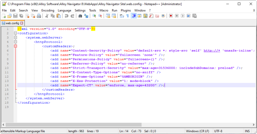 TIP: After you have added one of the headers, you can use Method 2 to copy and paste all the remaining headers to the web.config file. The table contains the HTTP response headers and the values that have been tested for use with the current 2023.1 version Alloy web applicationsClosed. TIP: If you need to specify other values for those headers or add other custom HTTP response headers, please contact our Support Team.