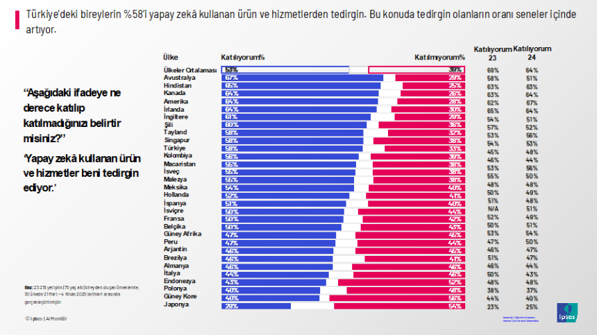 Ipsos Türkiye CEO’su Sidar Gedik bu tabloyu “Hem kaygı doluyuz hem de hayranlıkla bakıyoruz. Yapay zekâdan birçok şey bekliyoruz, ama bunların olumlu olup olmayacağından emin değiliz. En azından kısa vadede güven sorunu oldukça yaygın ama faydalarını da görmek istiyoruz.