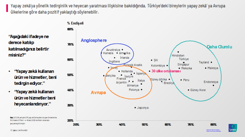 Ipsos’un küresel verileri, ülkelerin yapay zekaya yaklaşımında kültürel farklılıkları da gözler önüne seriyor. Örneğin; ABD, İngiltere, Kanada gibi Anglosphere ülkelerinde endişe düzeyi heyecanın oldukça üzerinde. Avrupa’da daha temkinli bir denge varken, Güneydoğu Asya ülkelerinde belirgin bir heyecan gözlemleniyor. Japonya ise hem heyecan hem endişe düzeyi açısından nötr bir tablo çiziyor. Türkiye ise daha umutlu ve heyecanlı ülkeler arasında yer alıyor.