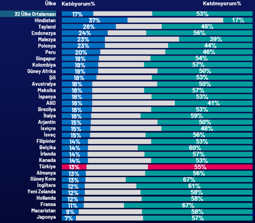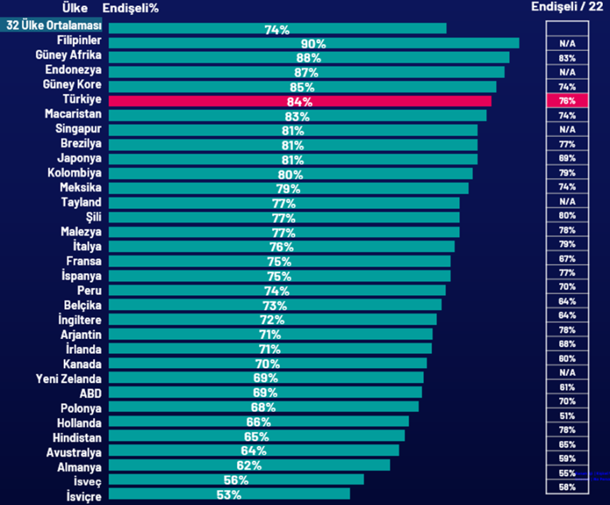 Araştırma, 2022 yılına kıyasla tüm ülkelerde iklim değişikliğine dair endişenin arttığını ortaya koyuyor. Türkiye’de bu endişe, dünya ortalamasının da üzerinde. Her 10 kişiden 8’i iklim krizinin etkilerinden endişe duyduğunu belirtirken, bu oran her geçen yıl artış gösteriyor.