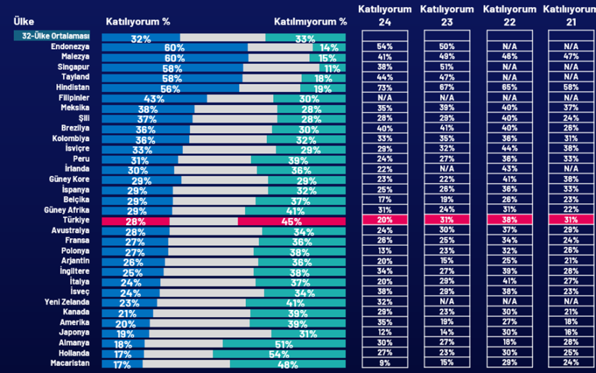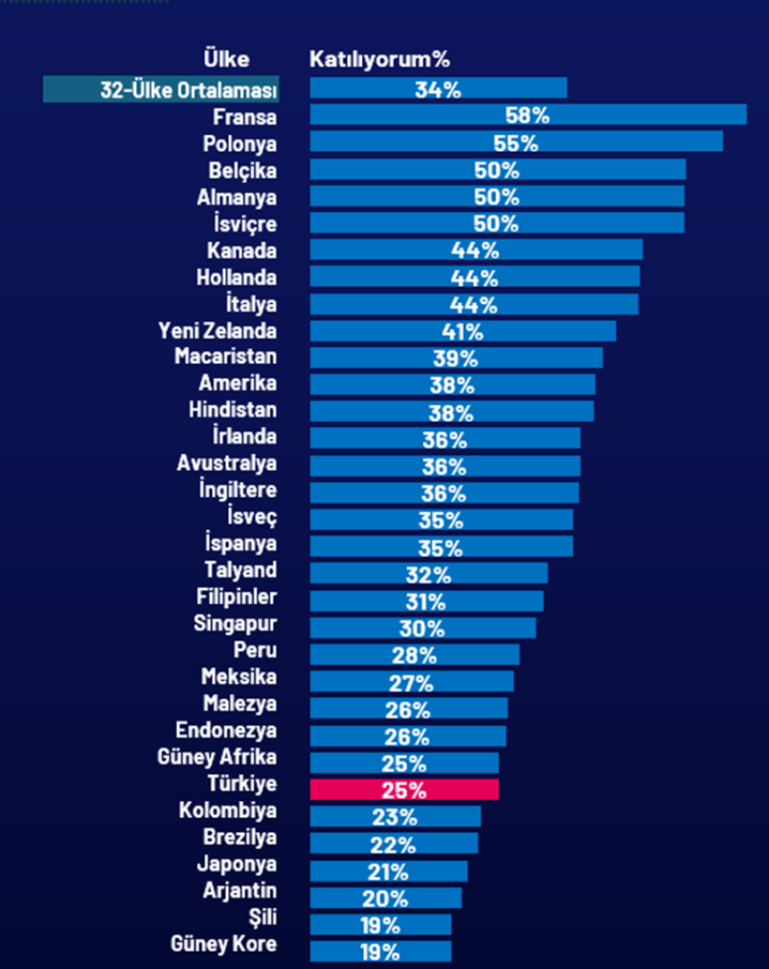 24 Ocak – 7 Şubat 2025 tarihleri arasında Online Panel sistemi aracılığıyla dünya çapında 32 ülkede gerçekleştirilmiştir. Örneklem, Hindistan’da 18 yaş ve üzeri, Kanada, İrlanda Cumhuriyeti, Malezya, Güney Afrika, Türkiye ve Amerika Birleşik Devletleri’nde 18-74, Tayland’da 20-74, Endonezya ve Singapur’da 21-74 ve diğer tüm ülkelerde 16-74 yaş aralığında toplam 23.745 yetişkinden oluşmaktadır. Türkiye’deki örneklem daha çok şehir merkezinde yaşayan, eğitimli ve daha yüksek gelirli vatandaşları kapsamaktadır.