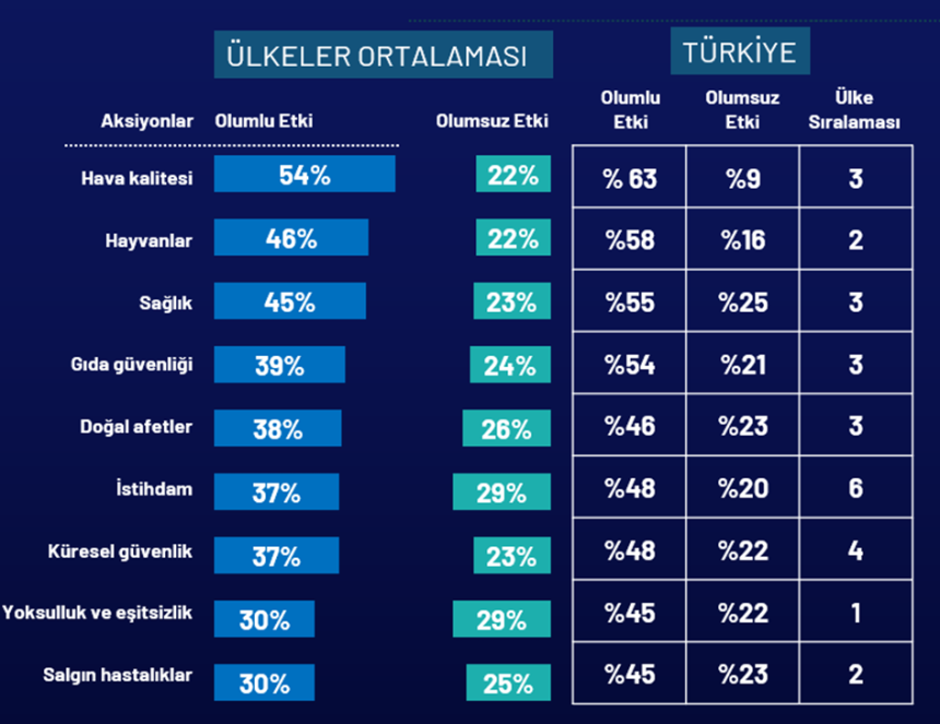 Ülkeler ortalamasında yenilenebilir enerjinin en olumlu etkisinin hava kalitesi üzerinde olacağı belirtilirken, Türkiye’de hava kalitesi, hayvanlar, sağlık, gıda güvenliği, doğal afet, istihdam, güvenlik, yoksulluk, salgın hastalıklar konularının tümünde olumlu etki yaratacağı düşünülüyor. Enerji konusunun önde gelen konularından biri olan elektrikli araçlarda ise farklı görüşler var. Avrupa ülkelerinde elektrikli araçlara karşı olumsuz görüş oldukça yüksek denilebilir. Türkiye’de ise olumsuz görüşlerin oranı daha düşük. Her 4 kişiden biri elektrikli araçların benzinle çalışan araçlar kadar çevreyi kötü etkilediğini düşünüyor.”