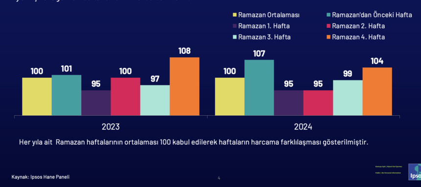 Ipsos Hane Paneli verilerine göre Ramazan alışverişi 2024 yılında, önceki yıla kıyasla biraz daha Ramazan öncesi haftaya kaydı. “Ramazan’a hazırlık alışverişi” davranışına geri dönüş eğilimi gözlemlendi. Bayramda misafir ağırlama motivasyonuyla Ramazan’ın son haftası çikolata, ikramlık şeker, Türk kahvesi, toz-kesme şeker, kuru yemiş kategorileri daha fazla miktarda satın alındı.
